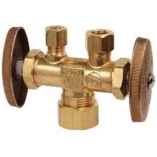 BrassCraft® CR1900DVSX R Multi-Turn Dual Outlet/Dual-Shut-Off Straight Stop, 1/2 x 3/8 x 1/4 in Nominal, Compression, 125 psi, Brass Body, Rough Brass, Domestic