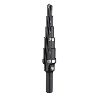 Milwaukee® step drill bits with jam-free performance feature a dual-flute design delivering up to 2X faster hole times, up to 4X longer life and up to 50% more holes per battery charge than competitors. Ideal for drilling small and large-diameter holes in steel and plastic, these bits are optimized for cordless drills in high speed. The Rapid Strike™ tip allows for a fast and accurate start that generates less heat, resulting in longer bit tip life. Black oxide coating also enhances durability, hole quality and bit life. For user convenience and accuracy, each bit has laser-engraved reference marks you can see while drilling. The 3-flat Secure-Grip™ shank ensures a solid connection with the drill chuck. The #2 step drill bit has 6 hole sizes in 1/16 in. increments ranging from 3/16 in. to 1/2 in..┬ájam-free performance in high speed with most professional 18 Volt cordless drills with lithium-ion battery technology.